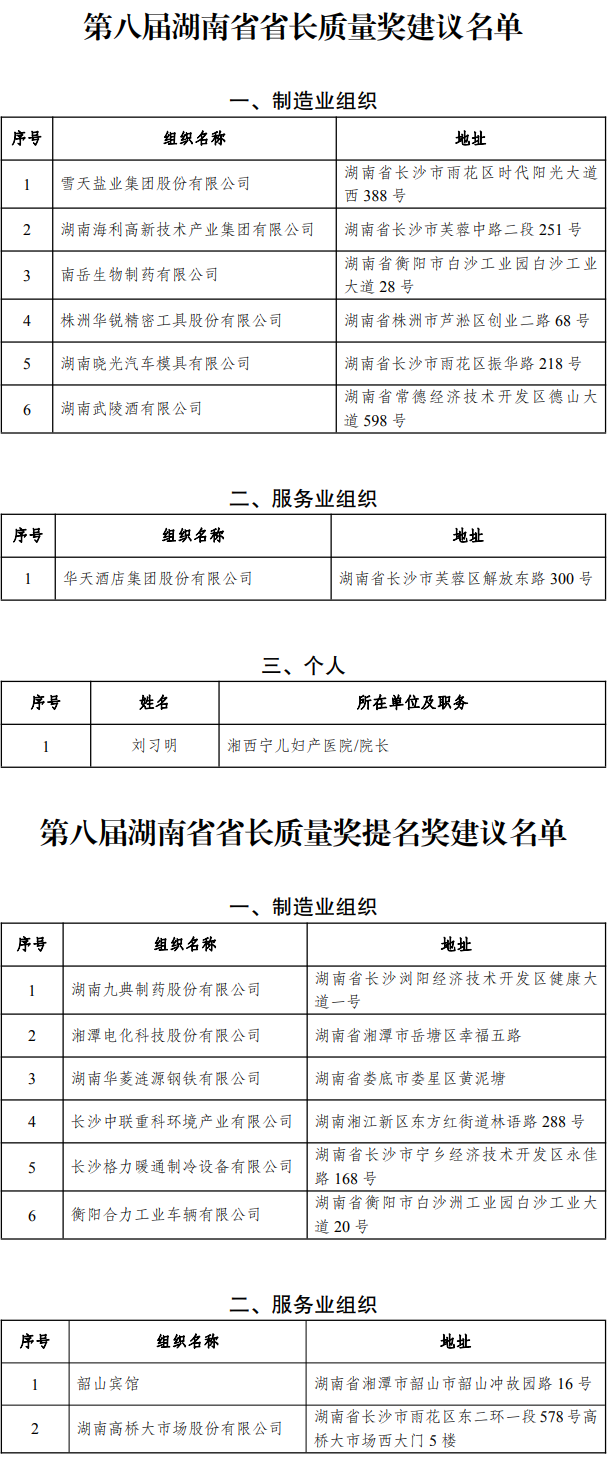 第八屆湖南省省長質(zhì)量獎及提名獎建議名單公示