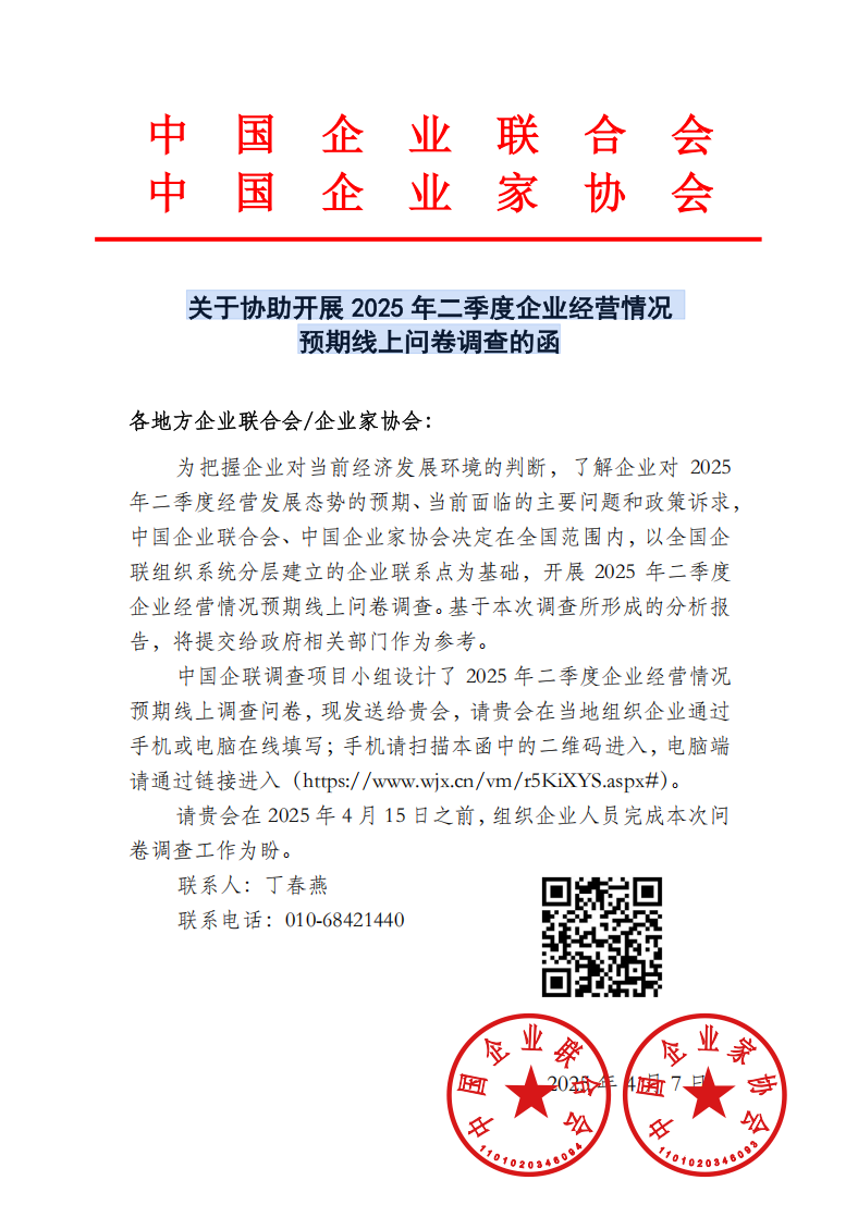 關(guān)于協(xié)助開展2025年二季度企業(yè)經(jīng)營情況預(yù)期線上問卷調(diào)查的函