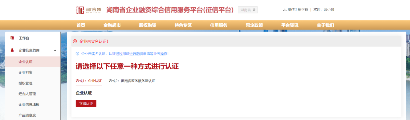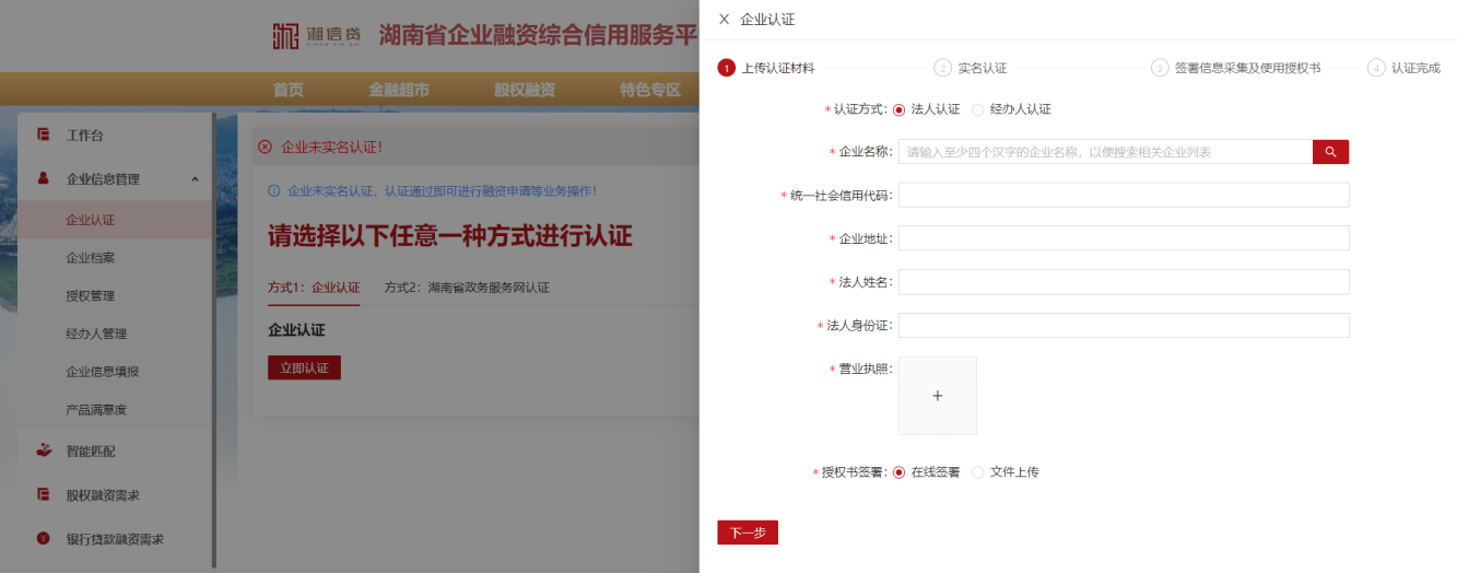 4、在企業(yè)實名認證頁面,選擇認證方式(企業(yè)認證:需上傳營業(yè)執(zhí)照信息,湖南省政務(wù)服務(wù)網(wǎng)認證:需在湖南省政務(wù)服務(wù)網(wǎng)開通了賬號),并按照認證流程進行操作。