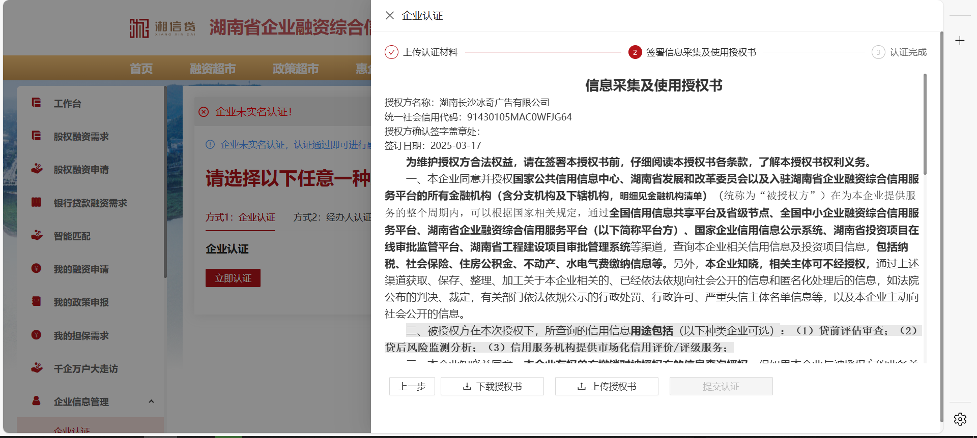 5、在完成企業(yè)認證后,進行企業(yè)信息采集使用授權(quán)書簽署上傳,允許平臺查詢企業(yè)相關(guān)基礎(chǔ)信息、納稅欠稅、不動產(chǎn)、水電氣繳費信息情況。